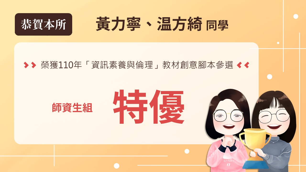 (正體中文) 賀 黃力寧、溫方綺 同學榮獲110年「資訊素養與倫理」教材創意腳本參選 師資生組 特優